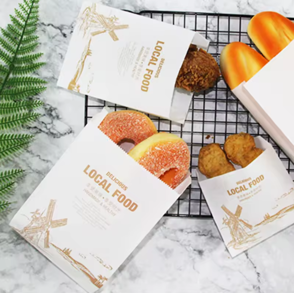 Our printed greaseproof paper bags (215 x 215mm) are perfect for greasy or oily foods such as chips, pastries, burgers, and baked or fried items. The white kraft exterior and greaseproof interior help maintain freshness and prevent leakage. These flat bags can be custom printed in full colour on both sides, providing a practical and attractive way to promote your brand while presenting food.